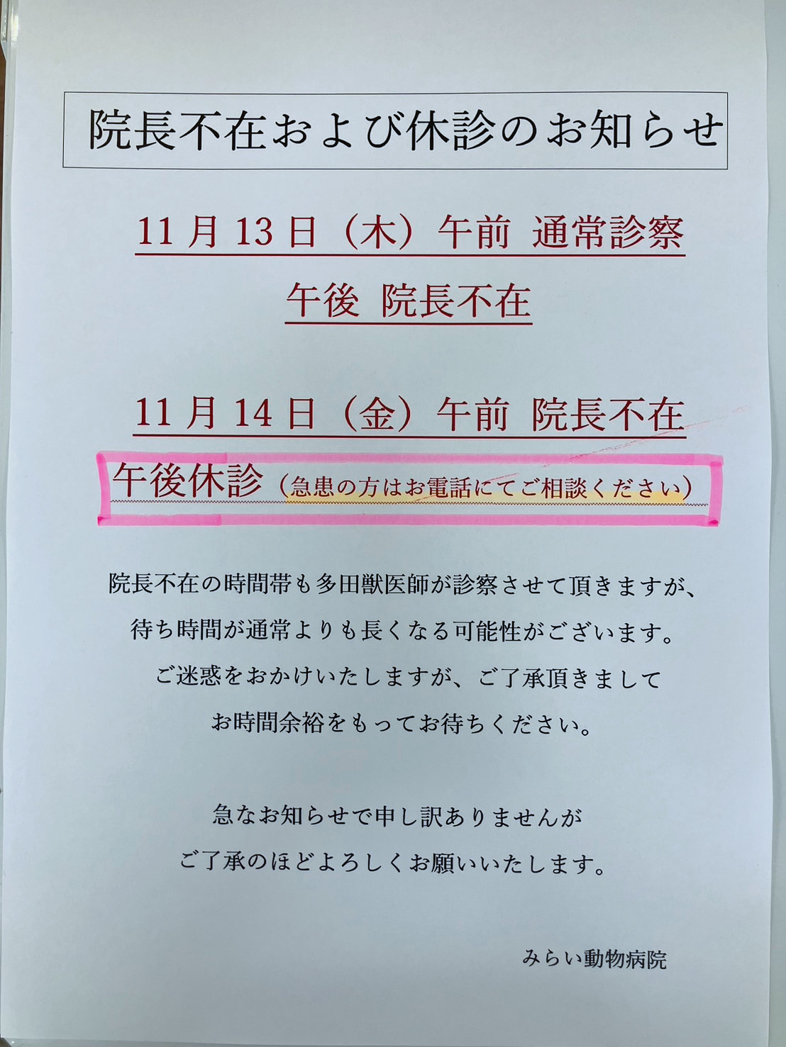 11/14(金)は「午前中院長不在」となります。多田獣医師1名のみとなりますので待ち時間が通常よりも非常に長くなる可能性があります🙇