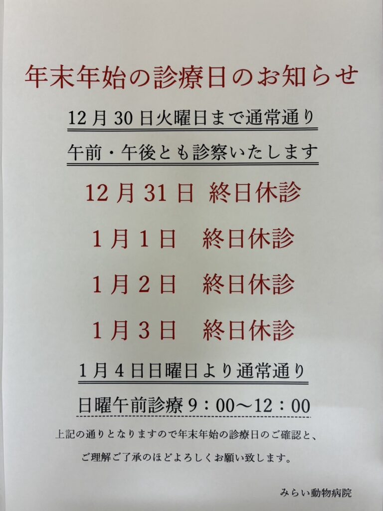 📢年末年始の休診について📢 お知らせ 2025-12-25 年末年始は12/31〜1/3まで休診となります📢 年末は12/30まで通常通り診察しております。 年始は1/4からの診察となりますが、日曜日のため午前診察となります。 お手元のお薬や療法食の残量をご確認いただき、休診期間中に無くなりそうな場合は12/30までに取りに来て頂きますようお願いいたします🙇 ご迷惑をおかけいたしますがよろしくお願いいたします🙇 皆様良いお年をお迎えくださいませ🎍