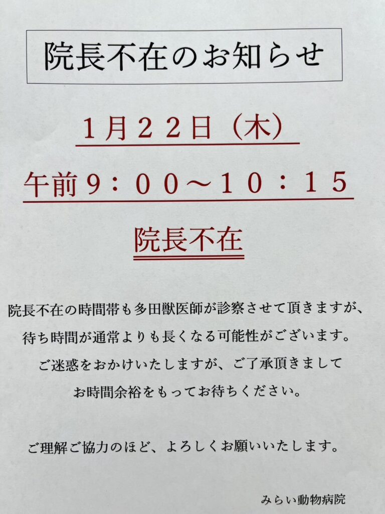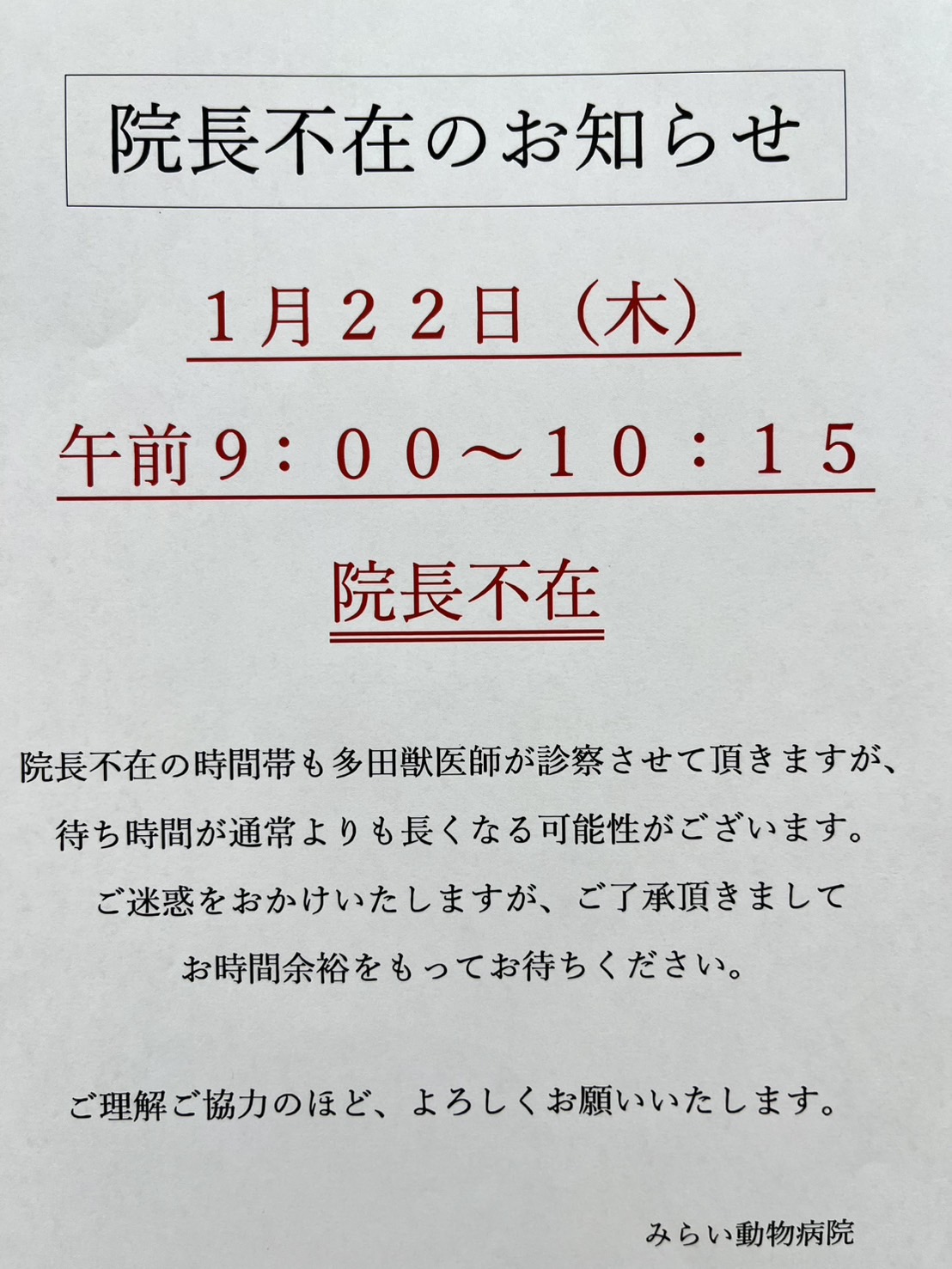1/22(木)は午前9:00〜10:15の間のみ院長不在となります📢