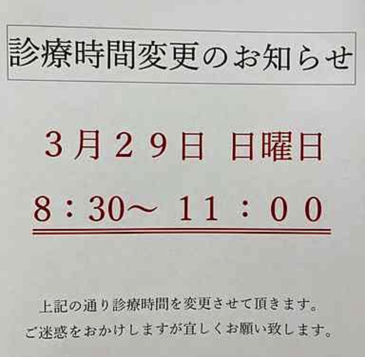 3/29(日)は診察時間が8:30〜11:00に変更となります。