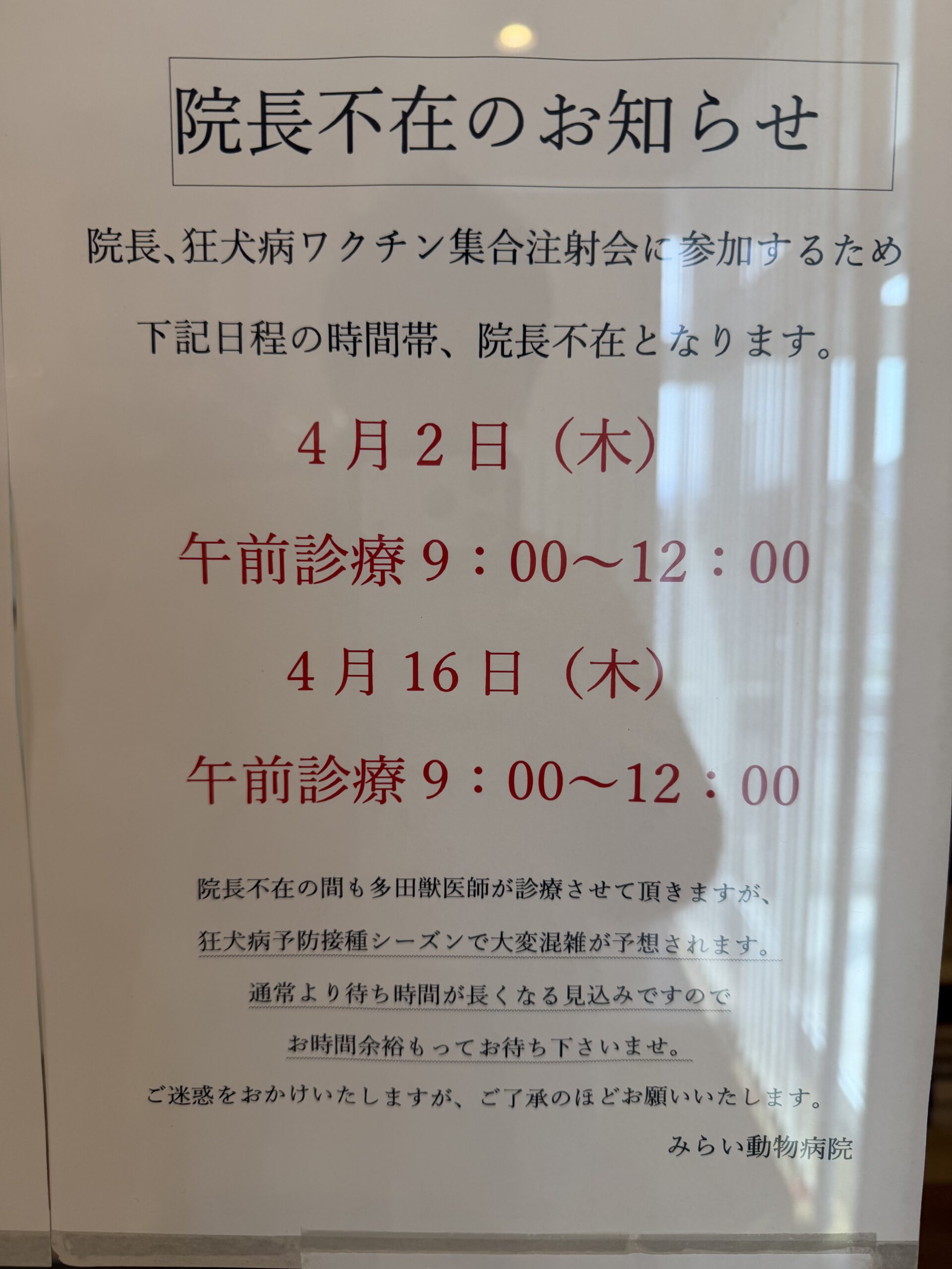 4/2院長午前中不在のお知らせ📢 お知らせ 2026-04-02 4/2(木)は狂犬病集合注射のため午前中院長不在となります。 多田獣医師がおりますので診察は行なっておりますが待ち時間が通常よりも長くなることが予想されます🙇 ご迷惑をおかけいたしますがよろしくお願いいたします🙇